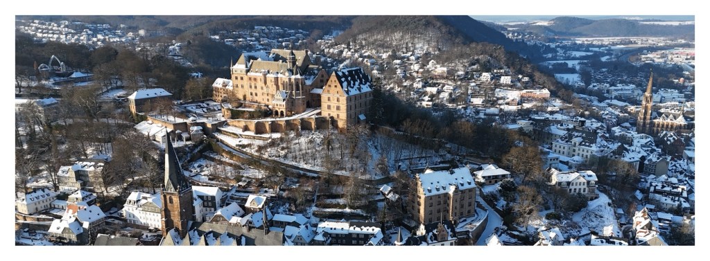 Das Landgrafenschloss von Marburg im Winterlicht. Drohnenaufnahme