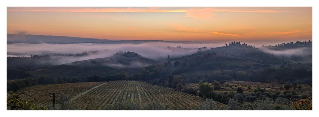 Morgennebel in den Tälern um San Gimignano in der Toskana